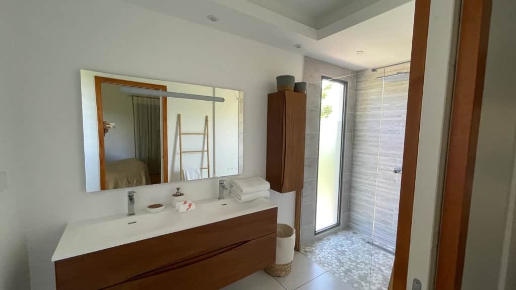 Perched high above Sainte-Anne, it offers a breathtaking view of the ocean, with no facing neighbors, no power lines, and no visual clutter — a true haven of peace in the heart of tropical nature.