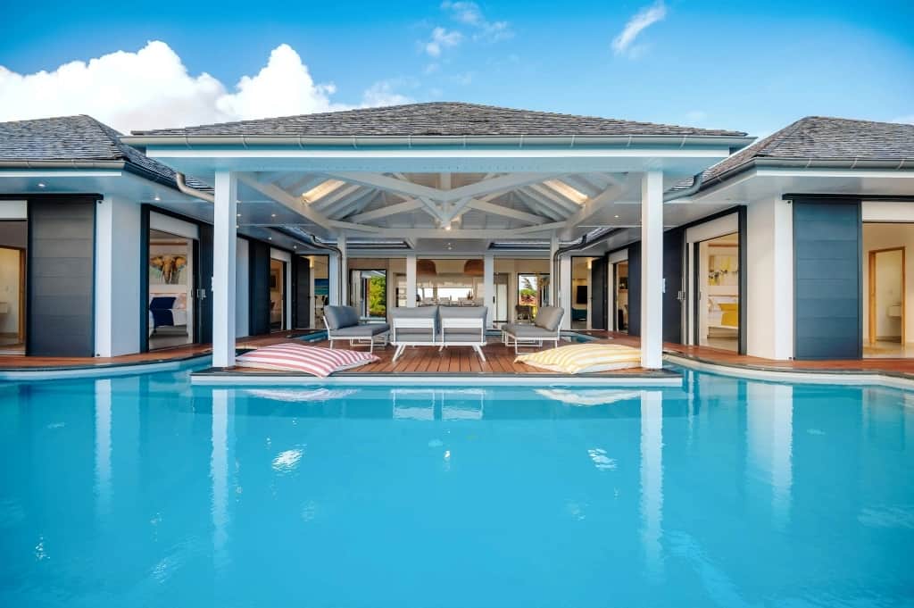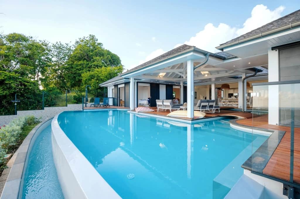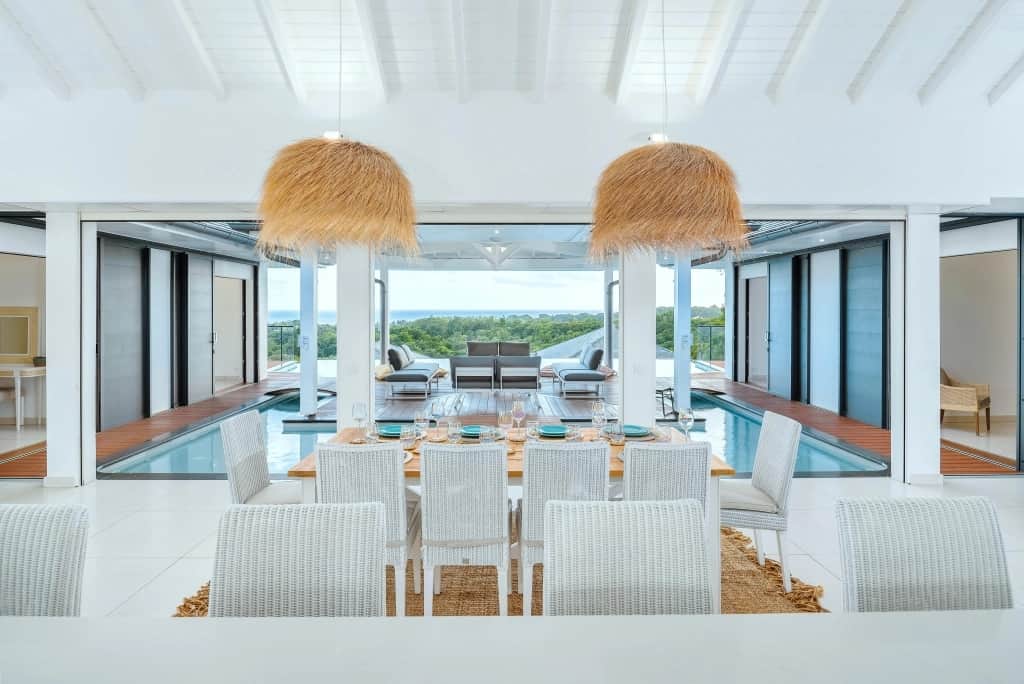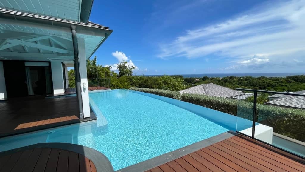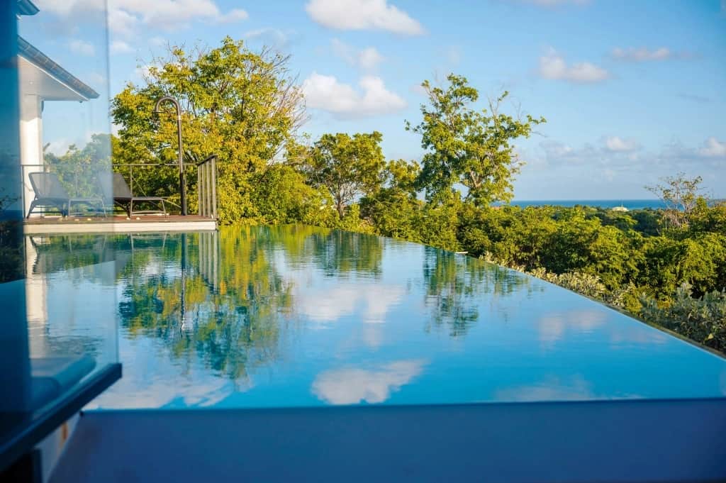 The villa’s centerpiece — a 51 m² infinity pool — offers a 180° panoramic view of the Caribbean Sea.